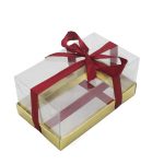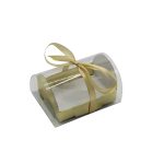 علبة تغليف مكعبة/صندوقية صغيرة بتصميم شفاف مثالي لعرض قطعة واحدة من الشوكولاتة، حبة تمر فاخرة، أو خاتم بسيط. القاعدة الذهبية اللامعة ترفع من قيمة العرض، وتأتي مع شريطة رقيقة بلون البيج الفاتح لتكون جاهزة للتقديم. اختيار مثالي لتوزيعات الأفراح وحفلات الاستقبال الصغيرة جدًا.